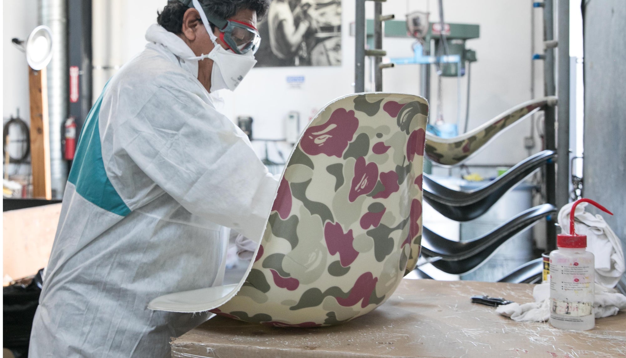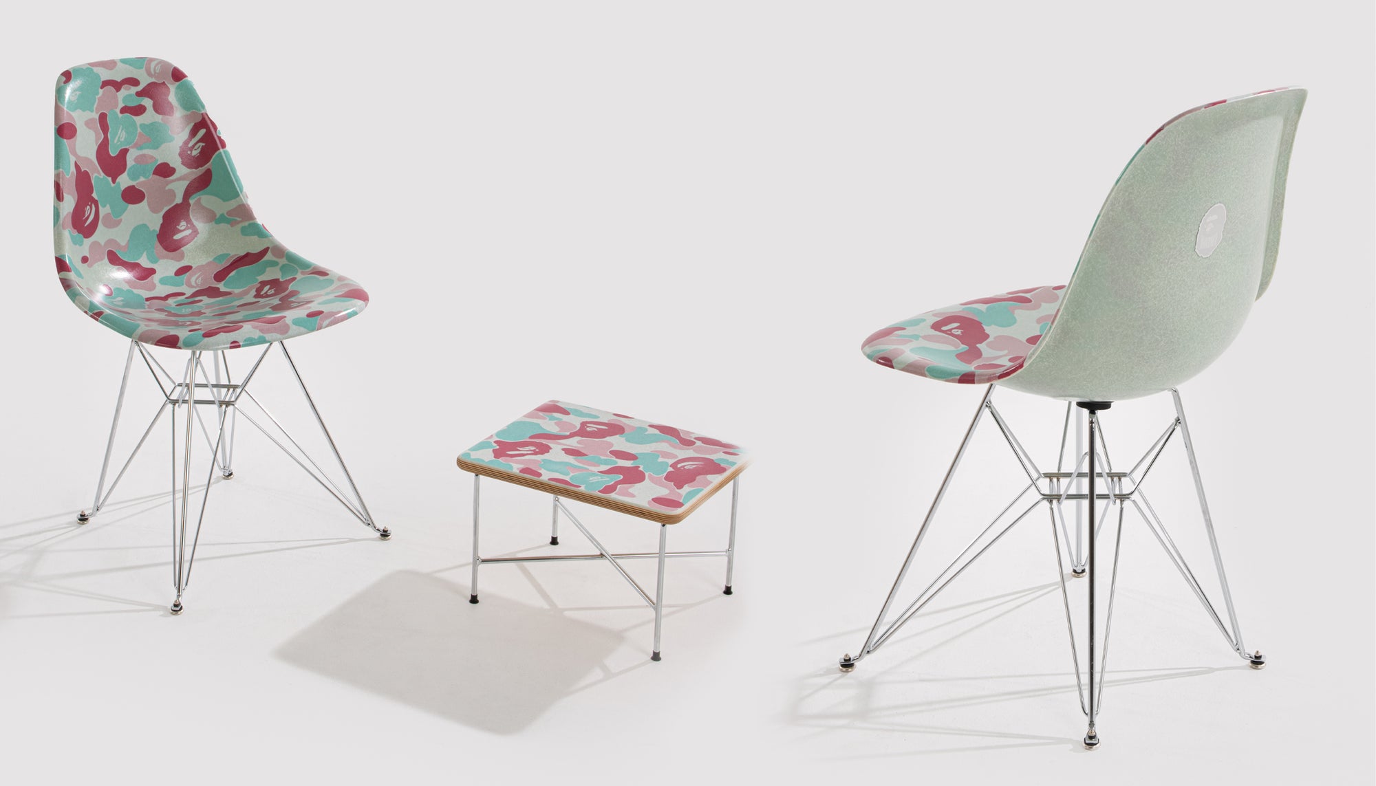 Modernica's long lasting relationship with Bape continued through 2022. From a 2019 collaboration celebrating the 1 year anniversary of Bape Los Angeles to NY, Miami & Asia exclusive colorway's expect to see more from this partnership. Modernica and Bape have created a wide range of items that include a Case Study® Furniture V-Leg Daybed, Aiko Tables, and a handful of exclusive colors of our Fiberglass Side Shell Chairs. Modernica uses a proprietary process that embeds the image permanently below the surface of the fiberglass chair.