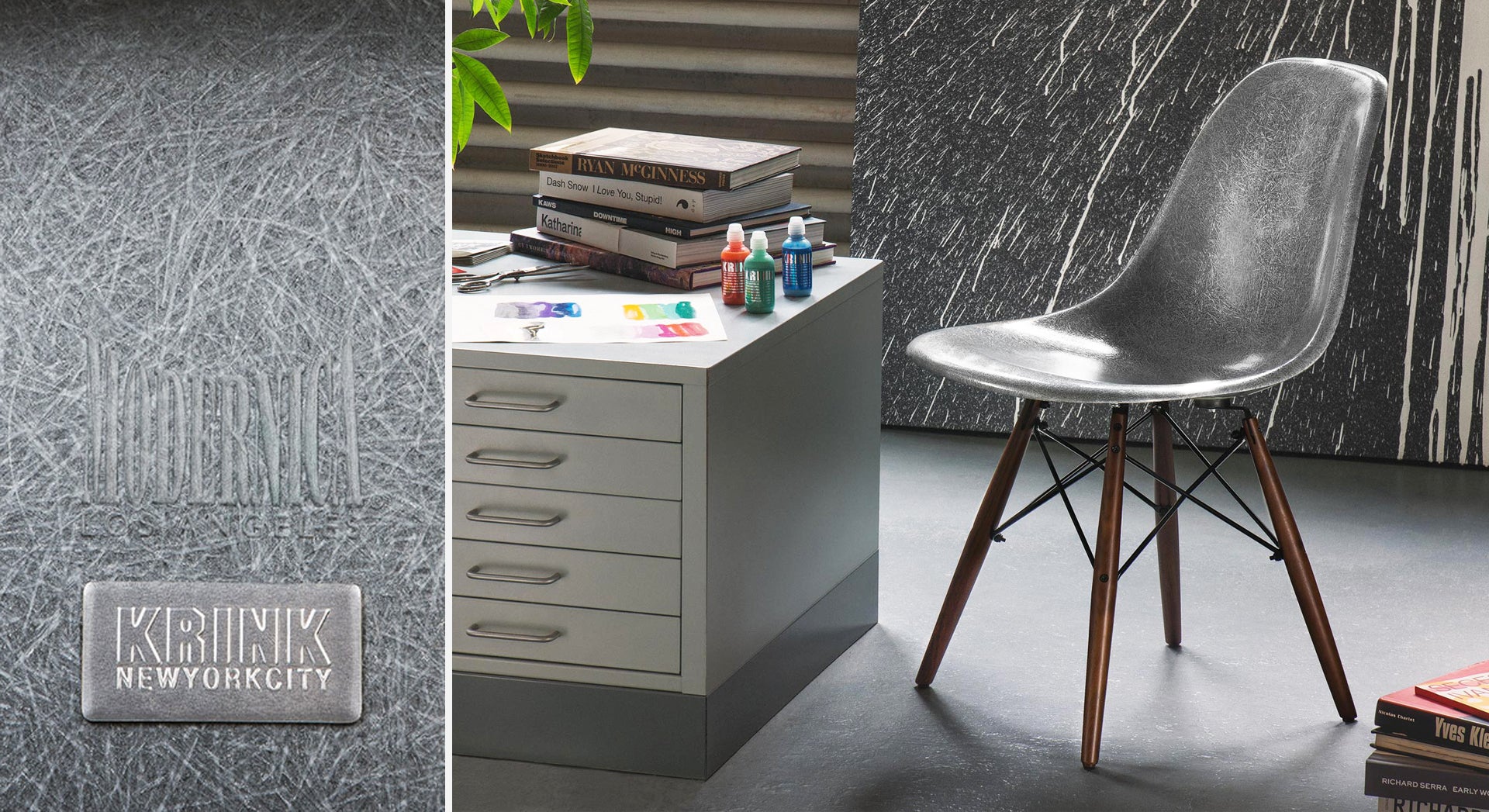 Modernica and Krink team up to bring a new color with a unique shimmer to a California design icon. Understated and neutral at first-glance, a closer look reveals the Krink Fiberglass Side-Shell shines in classic Krink silver. The individual strands of fiberglass catch and hold the silver-pigments producing a soft luster with changing light and perspective. As two companies who produce handmade goods in the USA, we are extremely pleased with this collaborative work that sees New York City and Los Angeles sensibilities perfectly combined. The Krink Fiberglass Side-Shell chair is made using the original mold and production techniques specifically designed by pioneers in mid-century American design.