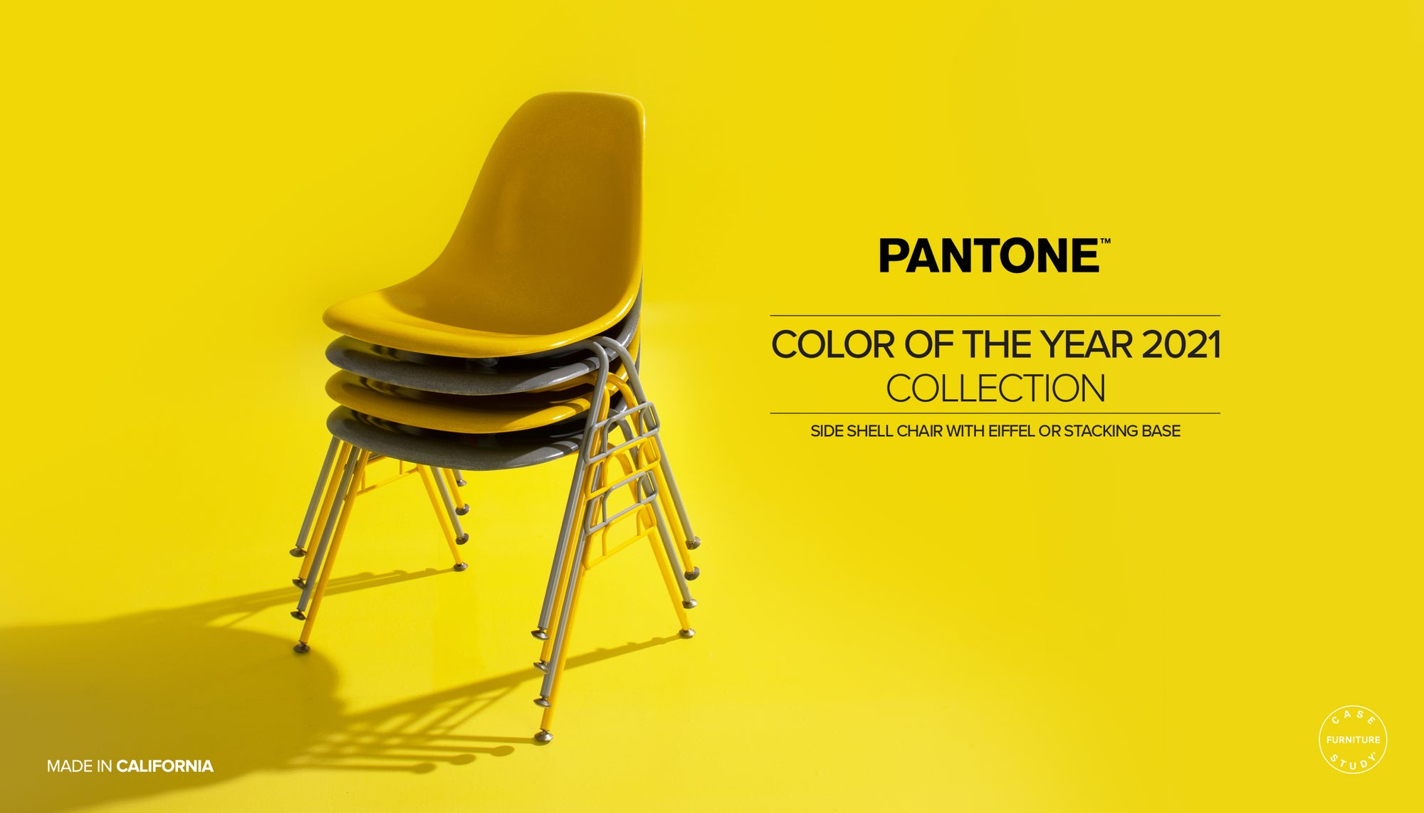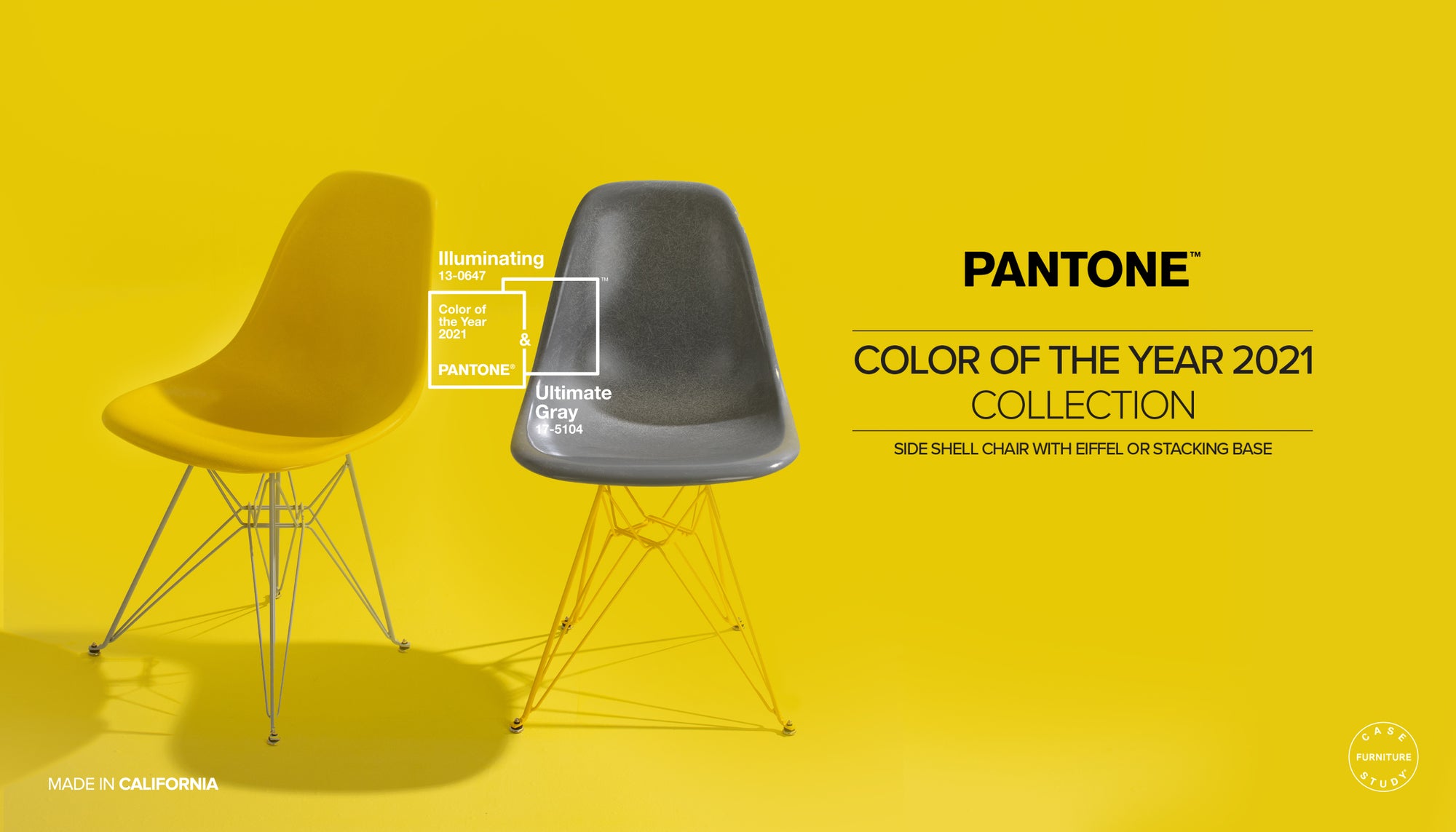 Modernica is honored to partner with Pantone™ for a limited edition Side Shell Eiffel & Stacking Chairs. In 2021, Pantone chose 2 Colors of the Year, 13-0647 Illuminating & 17-5104 Ultimate Gray. Two colors that highlight how different elements come together to support one another best express the mood for Pantone Color of the Year 2021.