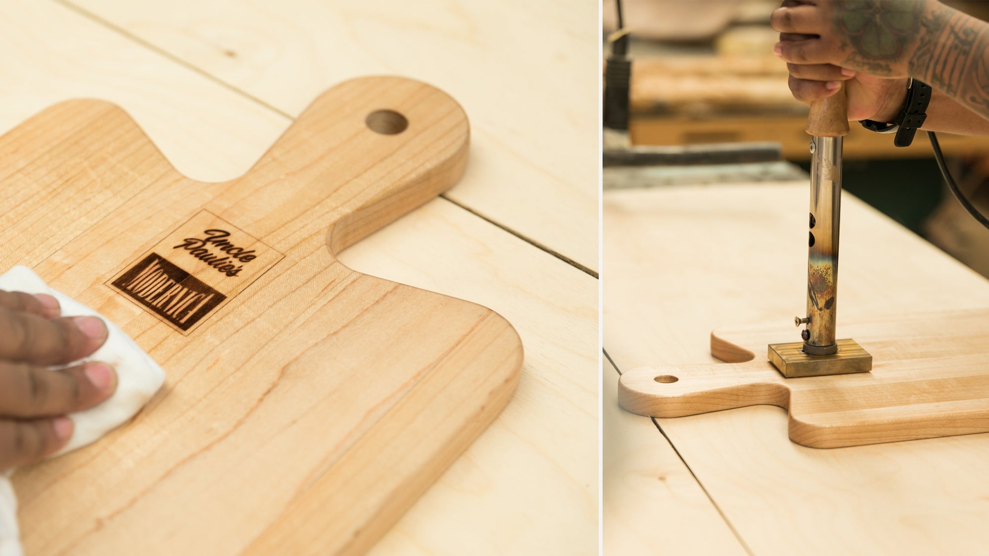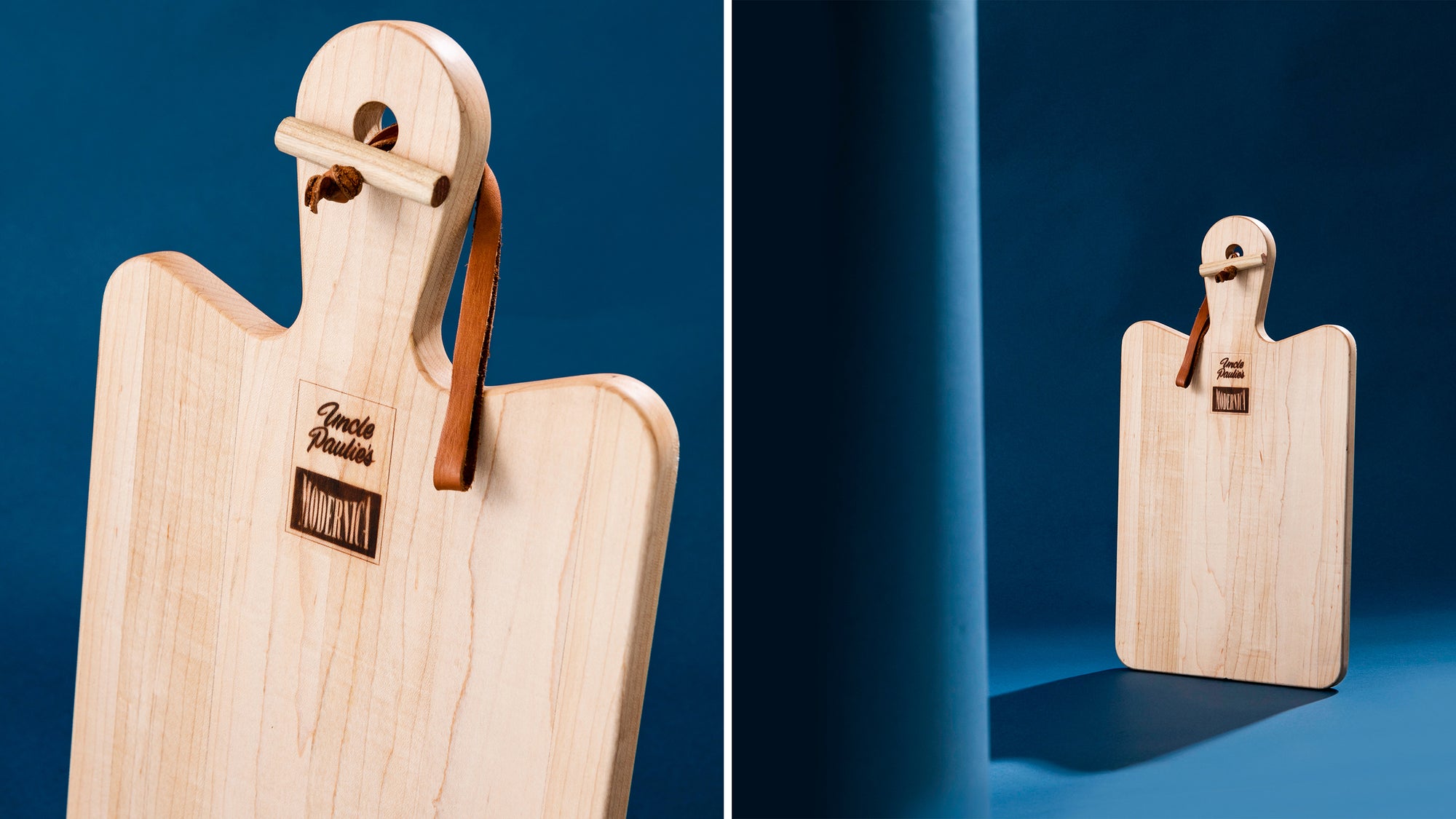 The Uncle Paulie’s x Modernica Limited Edition Cutting Board is crafted from solid maple and branded with a custom Uncle Paulie’s x Modernica logo. This board is sealed with food-safe butcher/cutting board oil, and its handle is finished with a leather strap for hanging purposes.